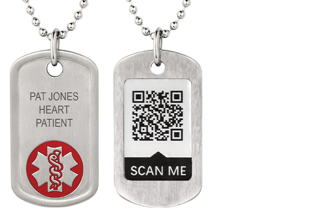 The QR Medical IDs provide an easy-to-scan QR code on one side of the ID and custom engraving on the other side of that ID. For the custom engraved side, include important health information such as medical conditions, allergies, medications, and more.