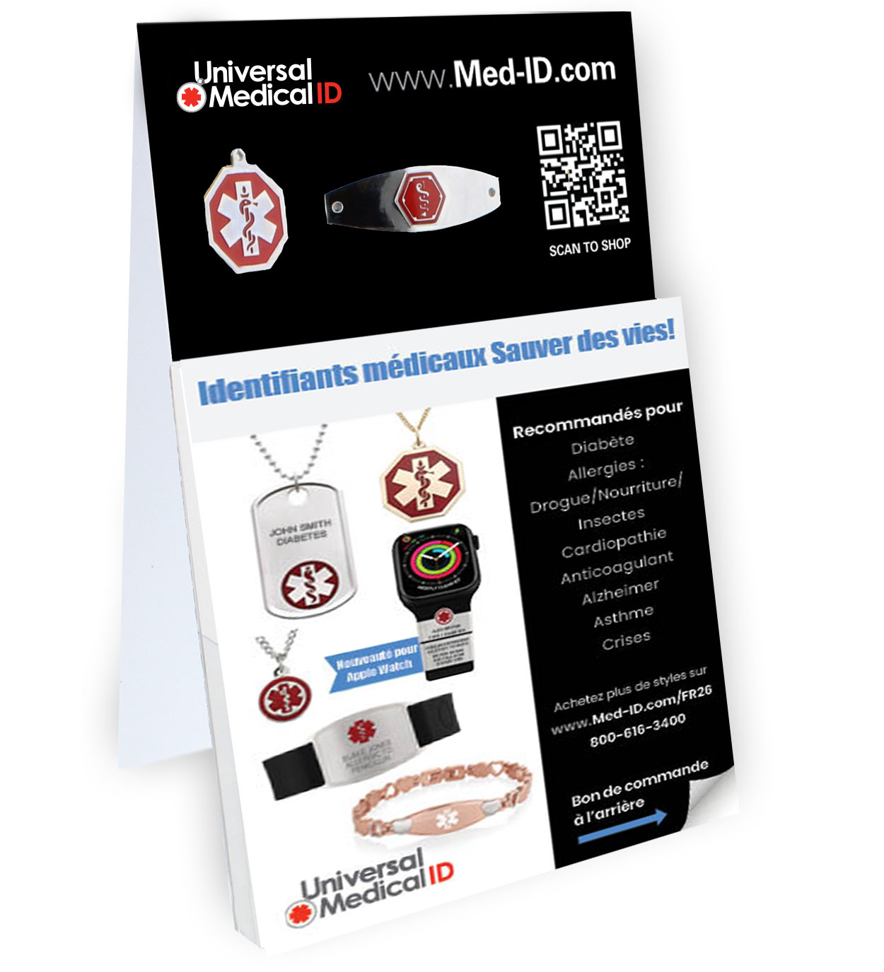 Complétez vos informations ci-dessous. Nous expédierons votre matériel dans un délai de 5 à 7 jours ouvrables, sans frais ni frais d'expédition. Cliniques ou hôpitaux plus grands, veuillez nous envoyer une note si vous avez besoin d'une plus grande quantité. De plus, pour un salon de la santé ou un autre événement, nous sommes heureux de faire don de présentoirs ou même d'un certificat-cadeau d'identité médicale.