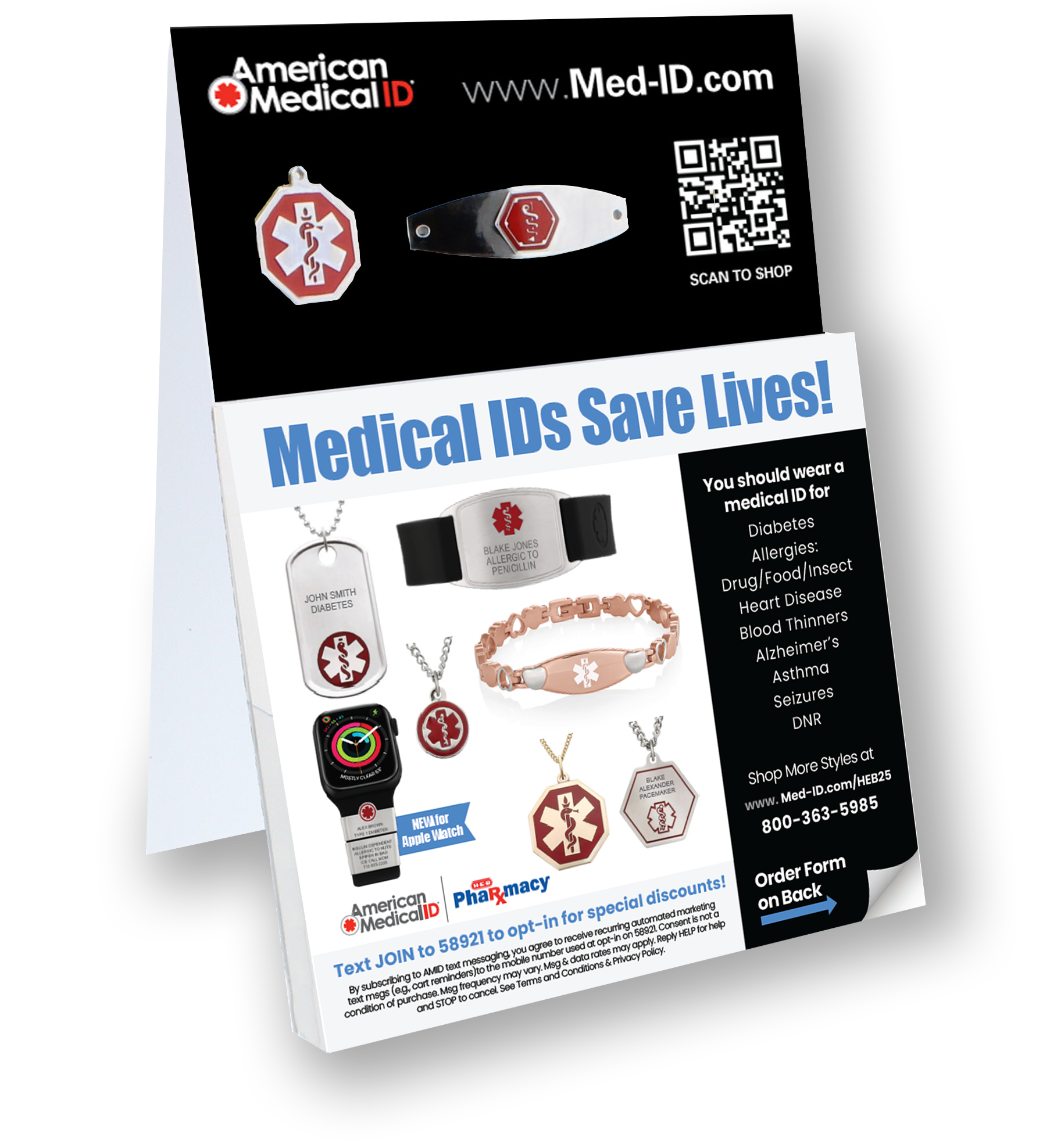 Our Partner Affiliate Program is primarily geared towards organizations with physical locations interested in marketing materials and displays to be distributed to their customers, patients and members. This simple to set up program provides retailers and businesses with a profitable method of offering engraved and personalized alert ID bracelets and necklaces.